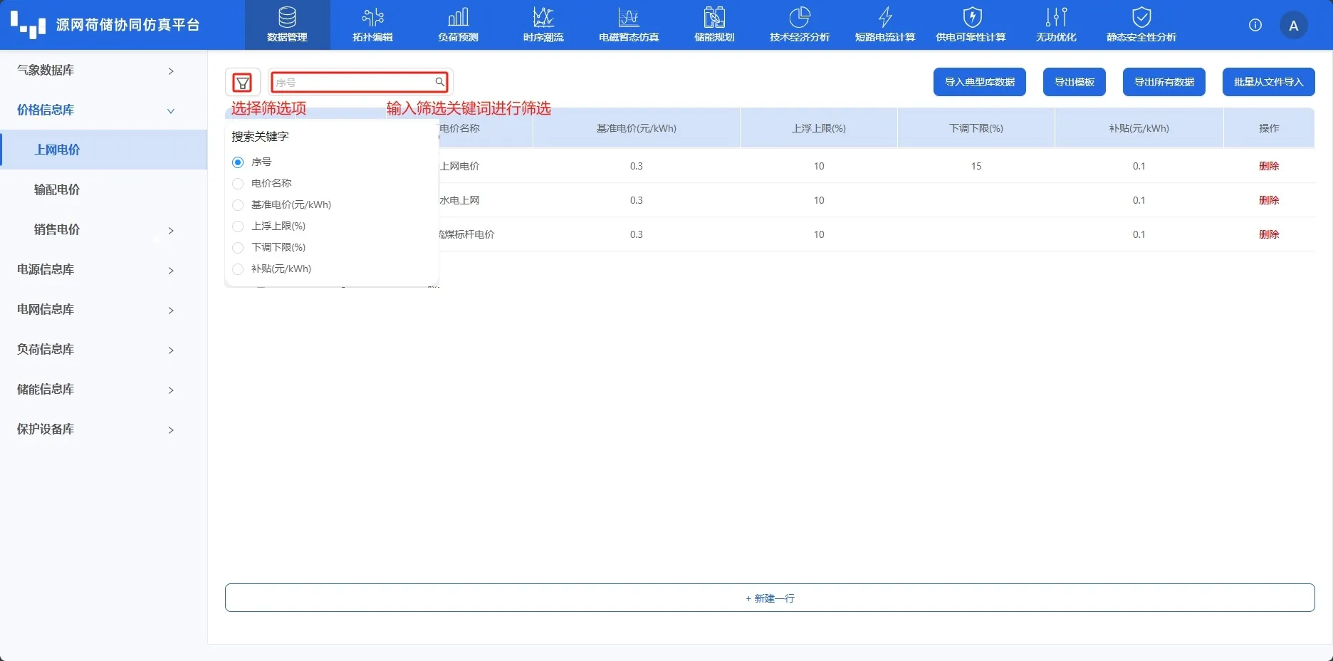 用户可在价格信息库中录入、编辑和管理上网电价、输配电价、销售电价(常数电价、阶梯电价、分时电价、分时阶梯电价)等信息,用作拓扑编辑模块元件的价格关联模型。用户可在拓扑编辑模块的元件属性中选择对应价格模型进行绑定。