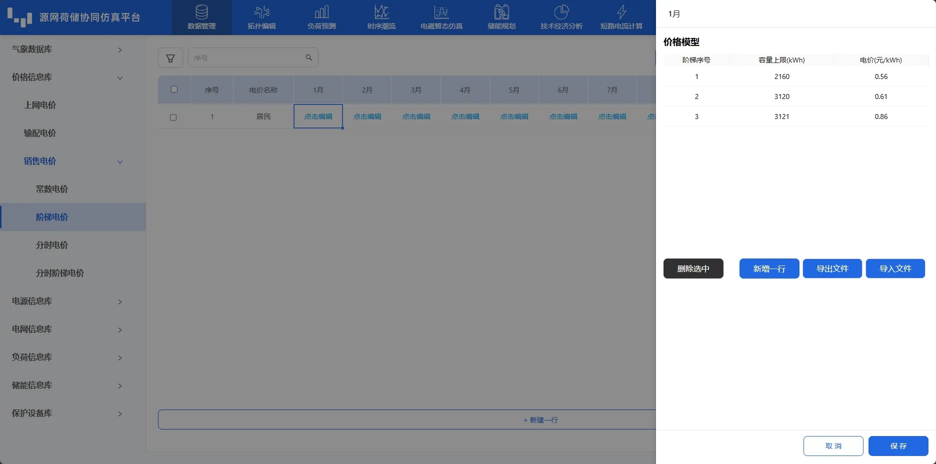 销售电价模型平台提供了分月常数电价、分时电价、阶梯电价和分时阶梯电价。电网的计价模型则用于计算项目支出。