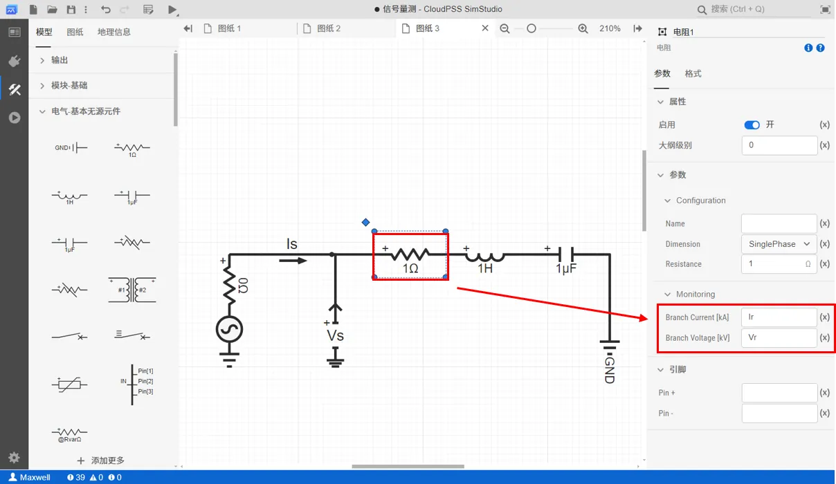 - 对于电气元件的电气引脚,可以直接量测其电压信号(单位为 V),但这种量测方法很容易导致单位错误,因此 CloudPSS 不推荐使用。