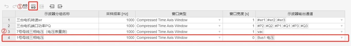 - 在该表格中插入 / 删除行,等同于添加 / 删除示波器窗口。