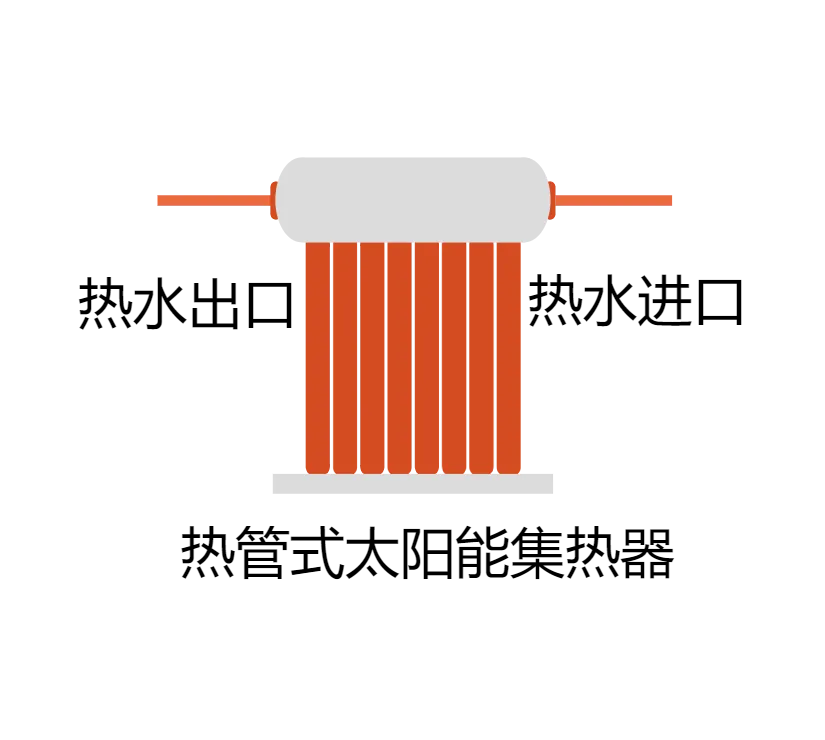该元件指热管式太阳能集热器的设备设施。利用热管式真空集热管来吸收太阳辐射能,以无机传热元件为传热媒体,进而加热联集管或水箱中的水。热管式真空管太阳集热器具有集热效率高、得热量大、输出温度高、承压运行快、结构强度高、抗冻性强、安装维护方便、使用中无漏水隐患、易实现和建筑结合、具备较长的使用寿命等特点,可广泛应用于各种规模和用途的太阳能集热系统中。其工作原理是利用金属吸热板吸收紫外线,当金属吸热板温度达到 20 时,热管中的工质就汽化向上运动,在运动过程中不断吸收吸热板上的热量,到达冷凝端时可达到 250,在冷凝端回流至热管底部,重复加过程。热管沿轴向分为蒸发段、绝热段和冷凝段,蒸发段使热量从管外热源传给管内的液相工质,并使其蒸发,气相工质在冷凝段冷凝,并把热量传递给管外的冷源。当冷源和热源隔开时,绝热段使管内的工质和外界不作热量传递,吸液芯靠毛细作用使液相工质由冷凝段回流到蒸发段及使液相工质在蒸发段沿径向分布。太阳能热水器中应用的热管一般为两相闭式热虹吸管(简称 TPCT),又叫重力热管,内部没有吸液芯,凝结的液体从冷凝段回到蒸发段不是靠吸液芯所产生的毛细力,而是依靠凝结液的自身重力。