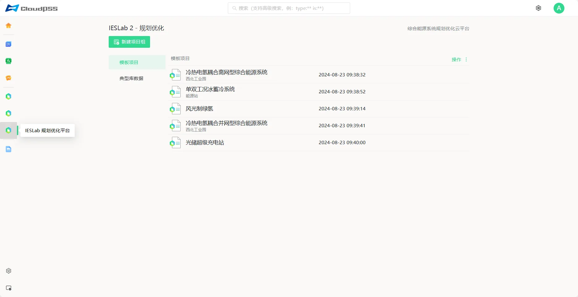 用户成功登录后,在 CloudPSS 个人中心点击 IESLab规划设计 的图标后,页面跳转至 IESLab 规划优化平台,该界面包含新建项目、项目管理等。
