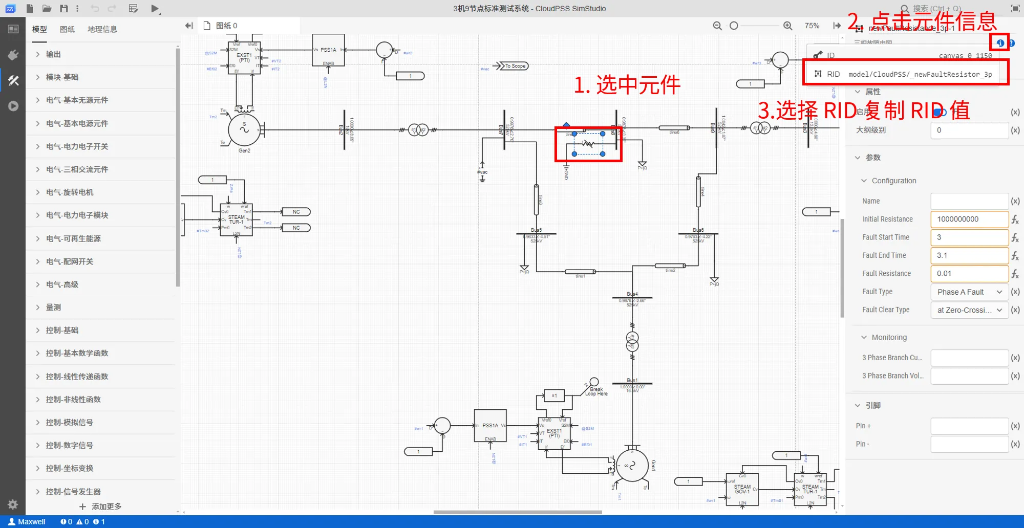 - 在 SimStuido 工作台打开该算例,选中元件,点击右上角的元件信息,选择元件 RID 即可复制该类元件的 RID 值。