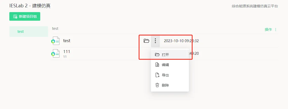 用户成功登录后,在 CloudPSS 主页点击 IESLab 2 建模仿真的图标后,页面跳转至 IESLab 2 建模仿真云空间,该界面包含项目组管理、项目管理等。