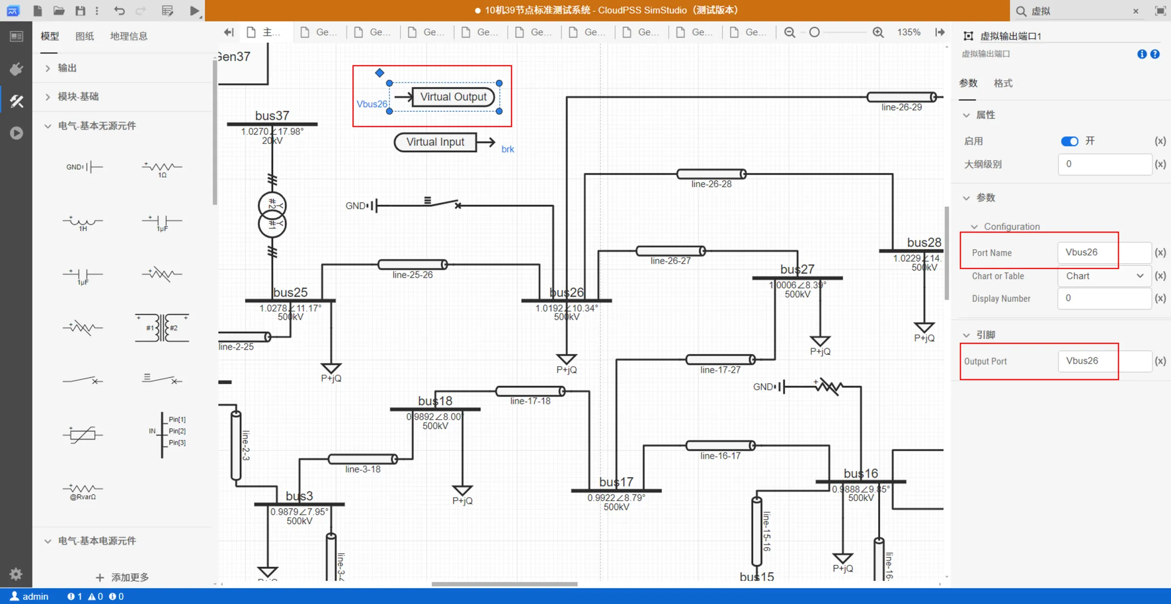 - 进入 SimStudio 平台新建一个 IEEE 10 机 39 节点标准测试系统,添加一个虚拟输入端口元件,名称配置为