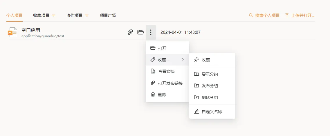 - 点击 收藏至XXX 按钮(例如:测试分组、发布分组、展示分组等),会把当前项目文件加入名为“XXX”的收藏分组(该选项仅在当前用户下存在自定义收藏分组时可用);
