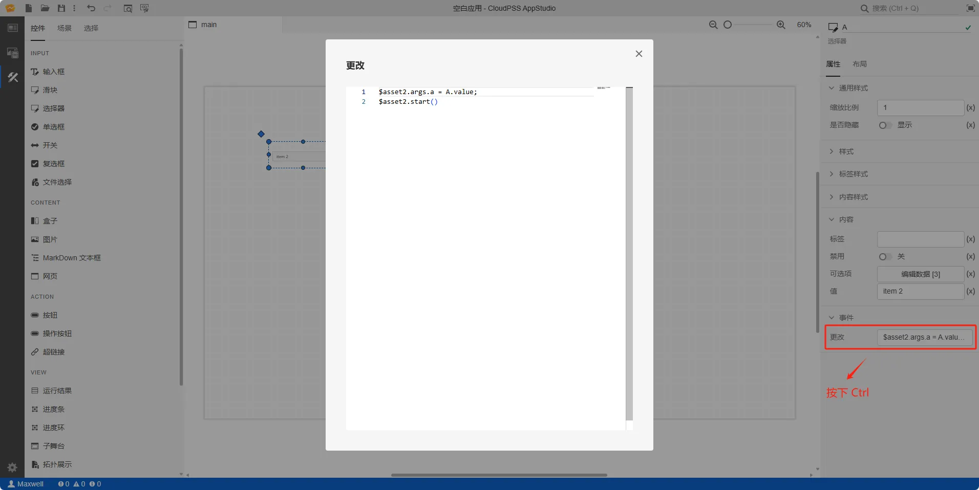 创建一个选择器控件,在右侧的属性配置区内给选择器命名为 A
