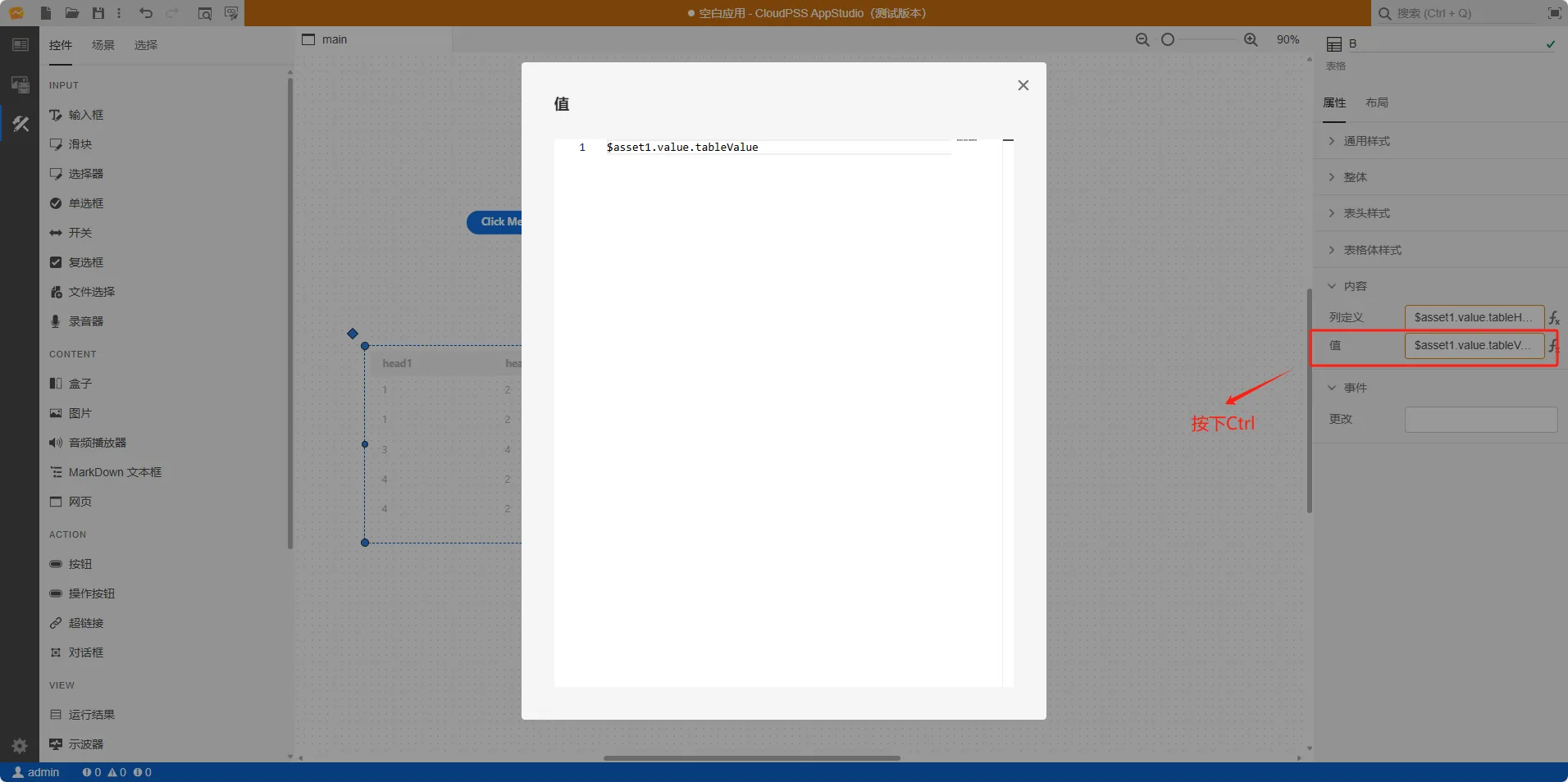 鼠标选中表格控件 B 的内容/值属性栏,按下 Ctrl 输入
