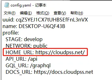 对于私有云平台,比如 CloudPSS-Mini 设备的用户,需要将配置文件的 HOME_URL 配置为 CloudPSS-Mini 的 IP 地址,如下图所示: