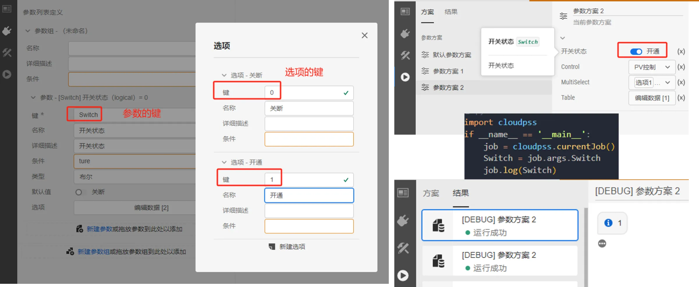 对于布尔、选择和多选等选项类型的参数,直接通过键名引用到的是每个选项的键。