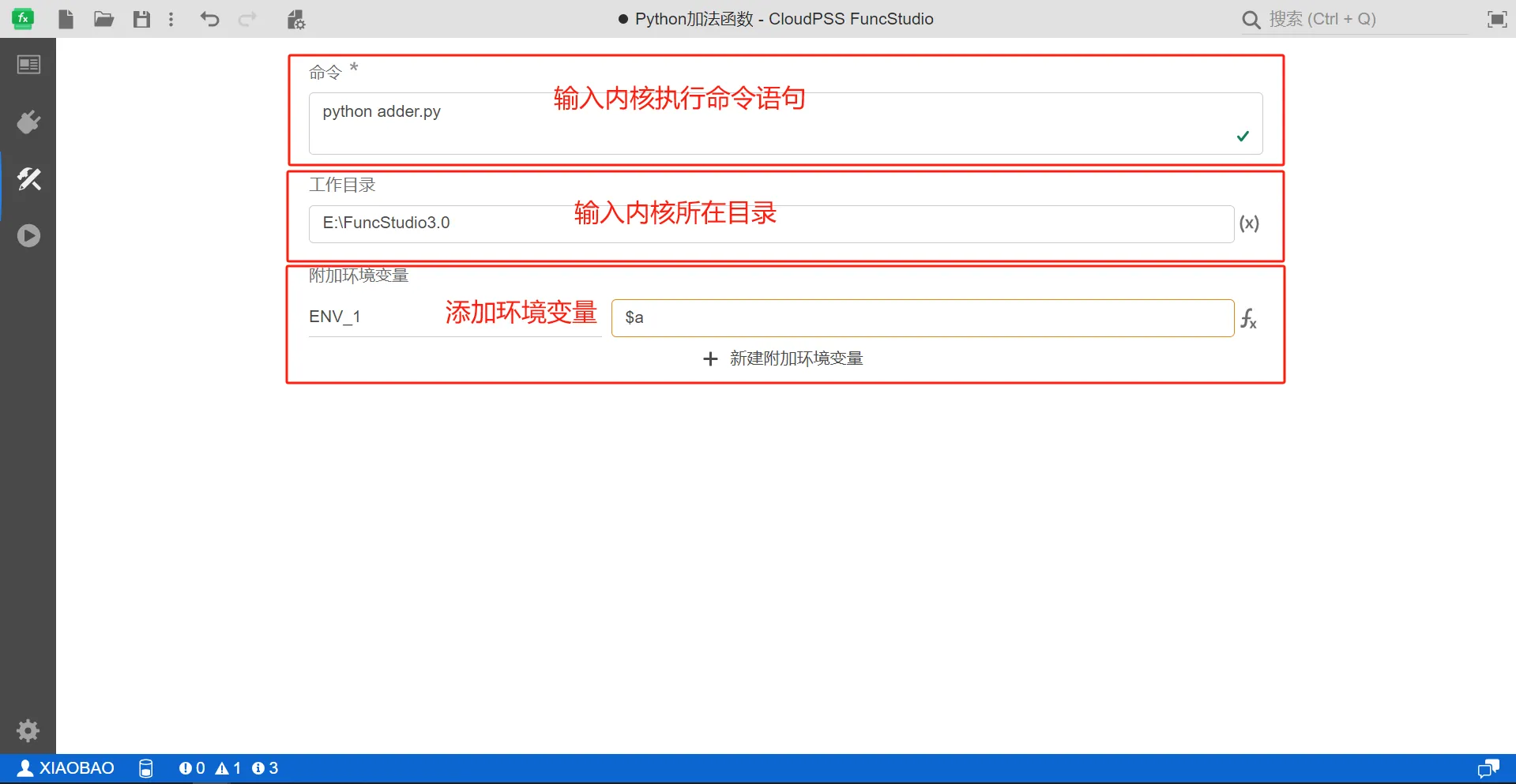 用户只需在命令窗口输入执行内核的命令行语句,在工作目录输入内核所在的目录,如有需要还可以添加内核的附加环境变量,FuncStudio 本地执行器会在本地执行内核。