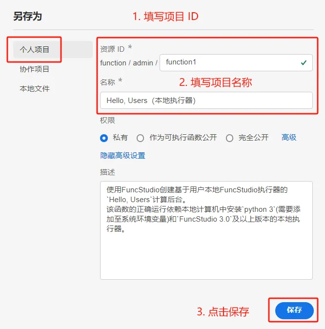 选择保存在个人项目时,必须填写资源 ID(RID)中的项目ID和名称,点击保存按钮即可实现项目文件的保存。