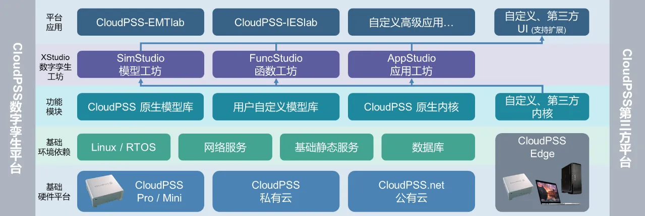 - 在底层硬件支撑层,CloudPSS 设计了专有计算设备,提供私有云和公有云部署等不同方案;