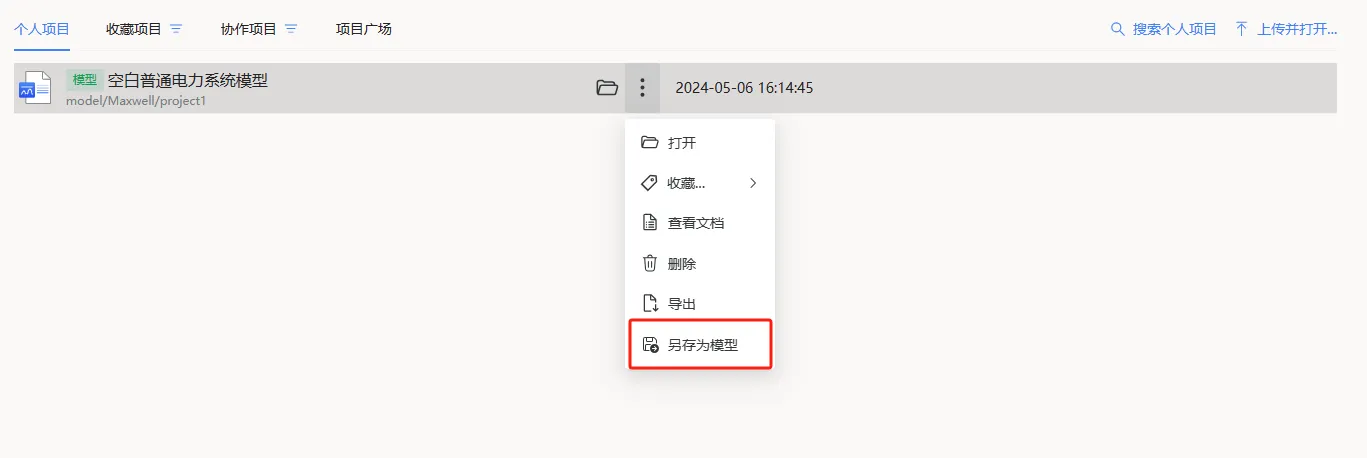 SimStudio 云空间 的项目管理区提供了项目打开、收藏、查看文档、删除、导入/导出、另存为等功能,方便用户高效管理大量模型项目。