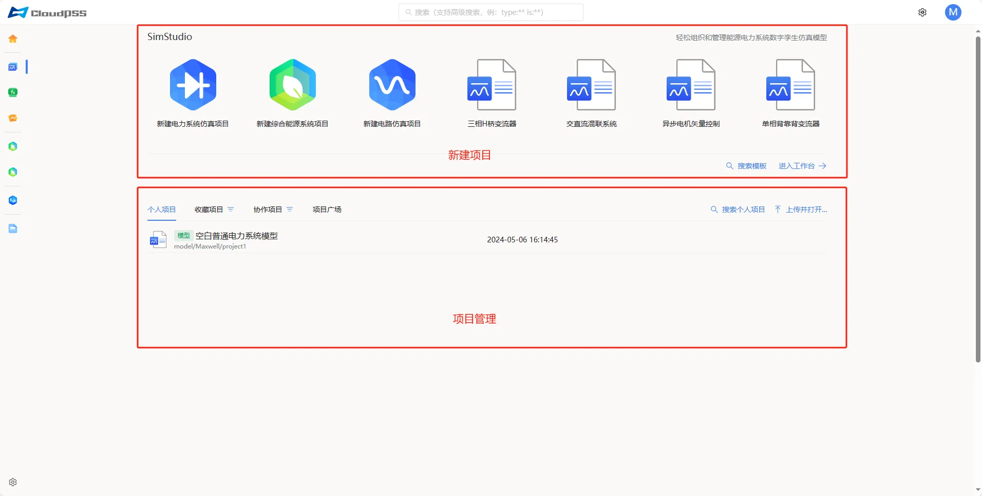 成功登录后,在 CloudPSS 个人中心 点击 SimStudio 的图标后,页面将跳转至 SimStudio 云空间。如图所示,该界面包含新建项目、项目管理两部分区域。