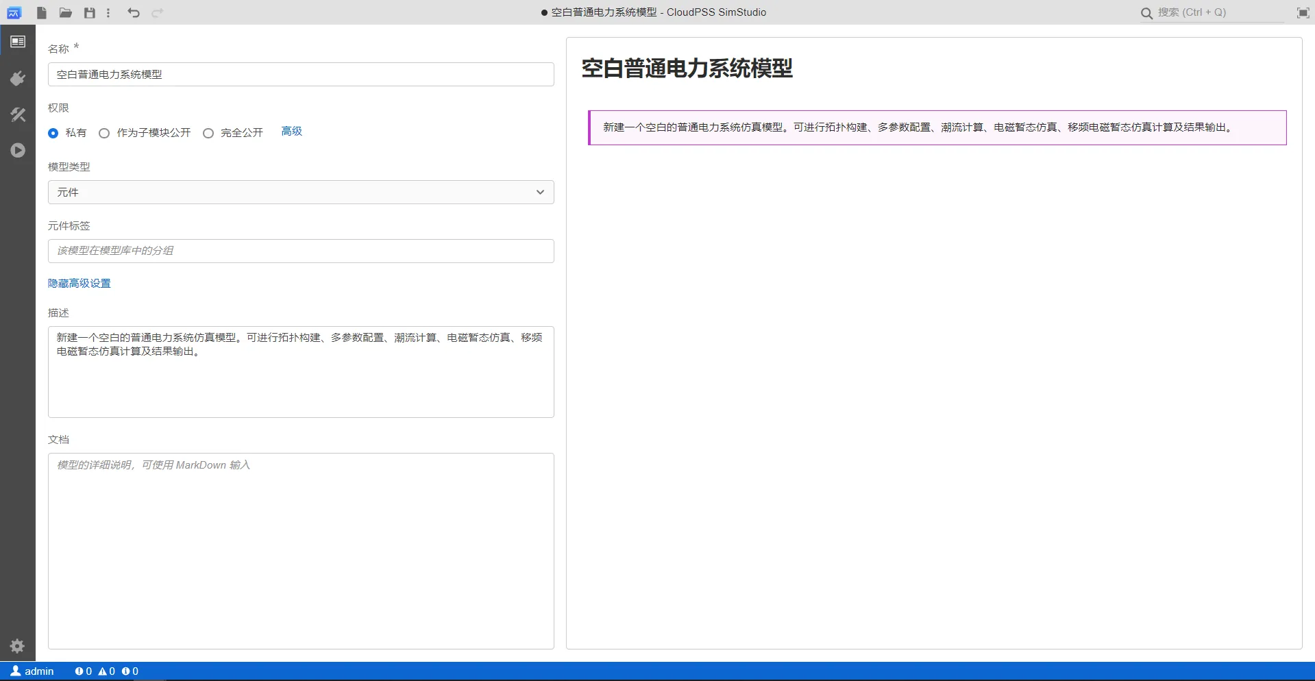 - 完全公开:该项目对所在CloudPSS平台的全部用户可见,在 SimStudio 云空间的项目广场中可见。除当前用户外的其他用户仅具备读权限,不能修改。